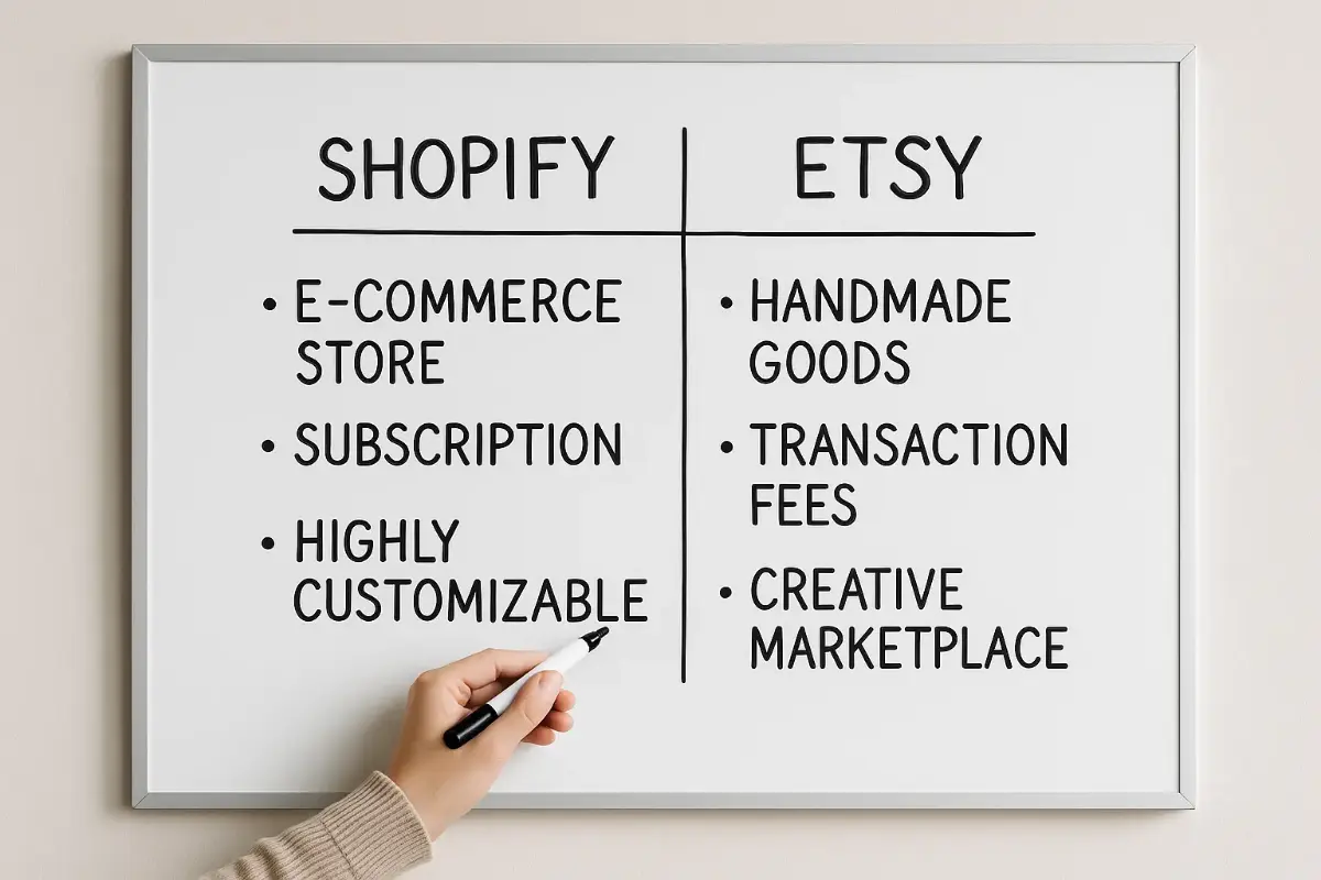 When I first started thinking about selling online, I kept bouncing back and forth between Shopify and Etsy. On one hand, Etsy looked super beginner-friendly — you just list your products and get access to a giant marketplace of buyers. On the other, Shopify felt like the “serious” option, where you could build your own store and brand.